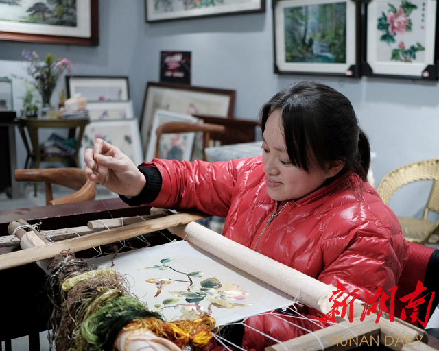(重度肢体残疾人刘晓菊在“菊姑娘湘绣圆梦馆”刺绣)