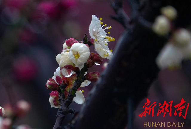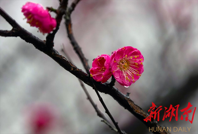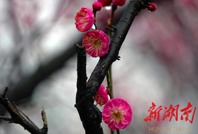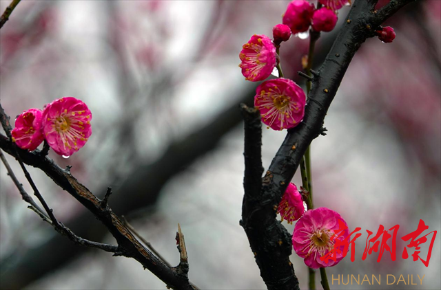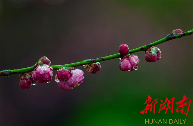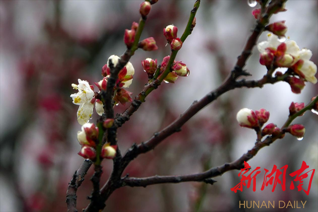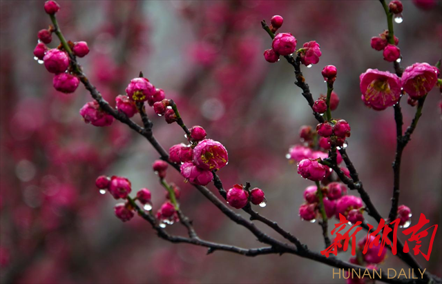 2月4日,农历正月十四,立春。柔情似水的绵绵春雨如约而至,深情拥吻湘中大地,蓄势待发的花骨朵开始绽放。飘飞的细雨凝结成一颗颗晶莹剔透的水珠,闪着清亮的光芒,点缀在花瓣上,树枝上。粉嫩的花蕊,鲜红的花瓣,娇艳欲滴。一棵棵梅花开成了这个节气里最动人的风景,一片片的花枝灿若彤云,一个个花枝形态各异。漫步其间,暗香浮动,着实让人心醉,让人惊叹于大自然的神奇。诗情画意让人慨叹岁月美好,时光宝贵,激励人们切不可辜负春光,辜负年华,迎着春风出发,努力奋斗创造美好生活!