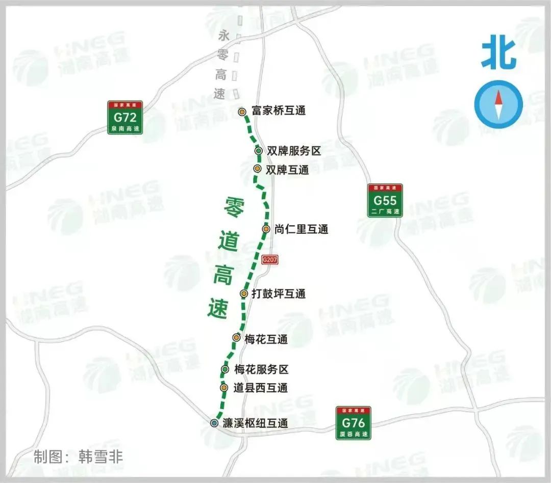 零道高速公路起于零陵区富家桥镇,北接永零高速,南至厦蓉高速,路线纵贯零陵区、双牌县和道县,全线长约75.412公里,桥隧比52.8%,概算总投资约为120亿元,全线采用双向四车道高速公路标准建设,建设工期4年,预计2026年建成通车。