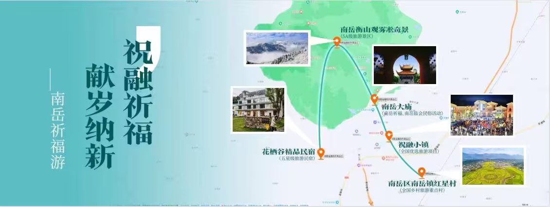 线路主要为南岳区南岳镇红星村(全国乡村旅游重点村)→南岳大庙(南岳祈福、南岳庙会民俗活动)→南岳衡山观雾凇奇景(5A级旅游景区)→祝融小镇(全国优选旅游项目)→花栖谷精品民宿(五星级旅游民宿)