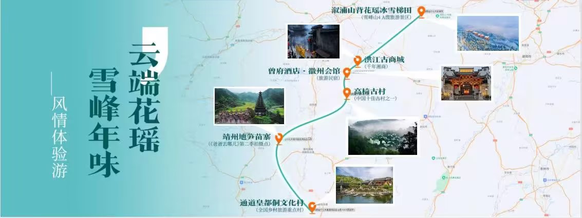 线路溆浦山背花瑶冰雪梯田(雪峰山4 A级旅游景区)→洪江古商城(千年湘商)→曾府酒店·徽州会馆(旅游民宿)→高椅古村(中国十佳古村之一)→靖州地笋苗寨(《爸爸去哪儿》第二季拍摄点)→通道皇都侗文化村(全国乡村旅游重点村)