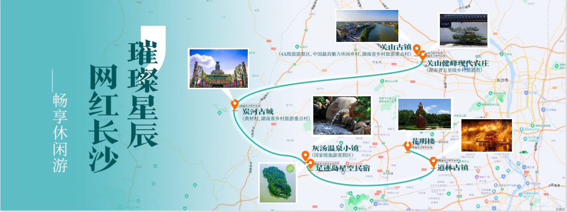 线路主要为关山古镇(4A级旅游景区,中国最具魅力休闲乡村,湖南省乡村旅游重点村)→关山健峰现代农庄(湖南省五星级乡村旅游点)→炭河古城(黄材村,湖南省乡村旅游重点村)→灰汤温泉小镇(国家级旅游度假区)→足迹岛星空民宿→道林古镇→花明楼(5A级旅游景区)