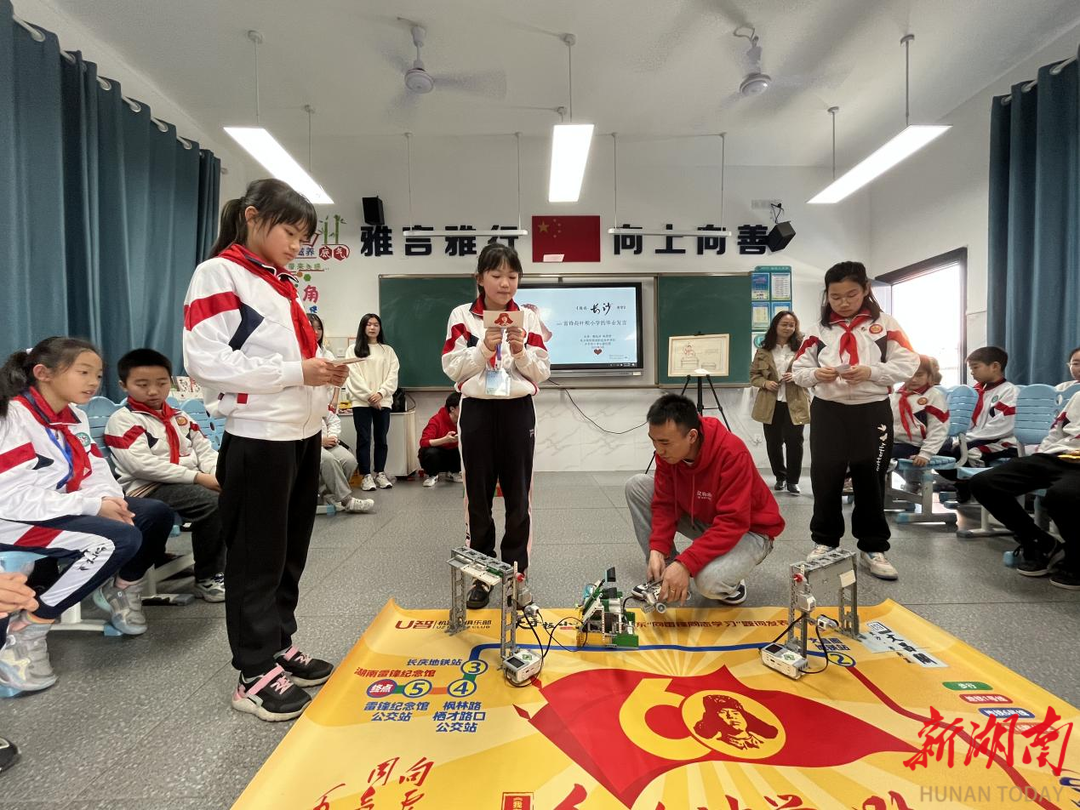 为了让学生身临其境探寻雷锋故事的红色之旅,该社团携手U智机器人俱乐部设计了“青园小学——湖南雷锋纪念馆红色游学之路”地图,只见同学们围坐在地图边,林悦尔等5位小学生播报行车调度指令,让积木搭建的人工智能机器车沿着红色游学之路动起来,车载着全班同学的求学之心踏上游学雷锋家乡、探寻雷锋故事的红色之旅。