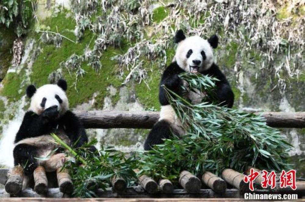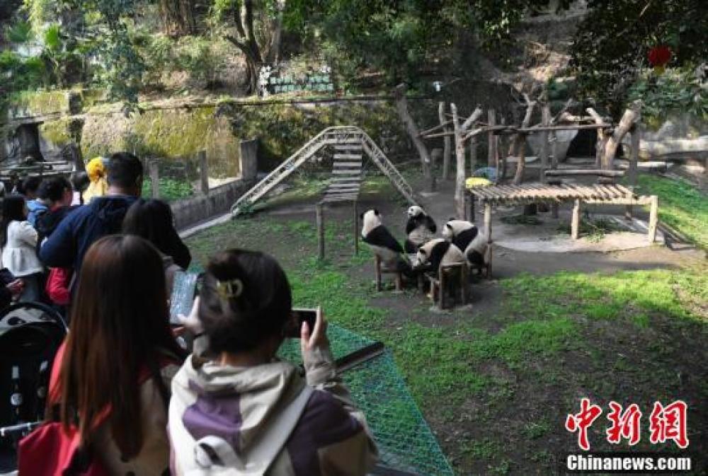 重庆动物园四只大熊猫“围炉煮茶”享用美食引围观。周毅 摄
