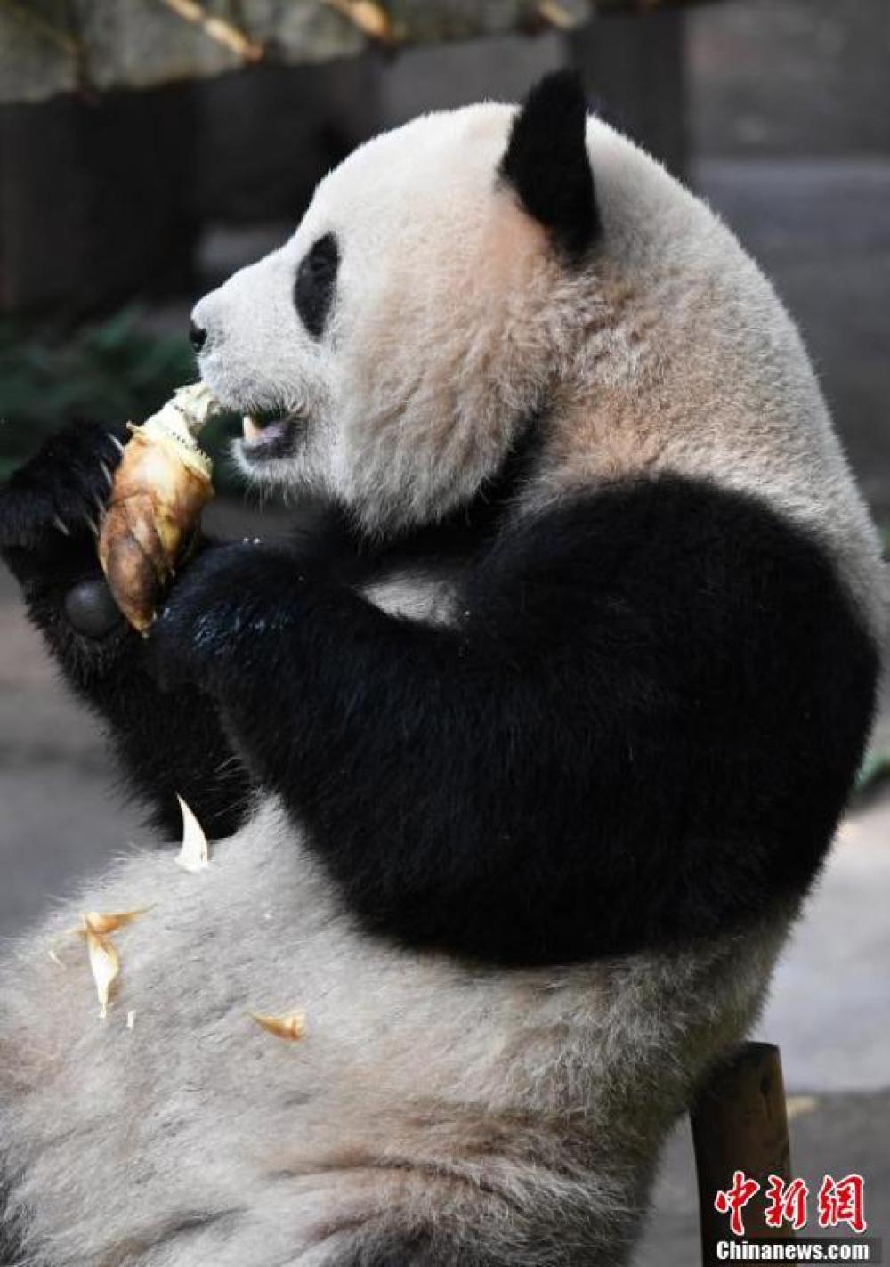 重庆:大熊猫“围炉煮茶”享用美食萌态十足