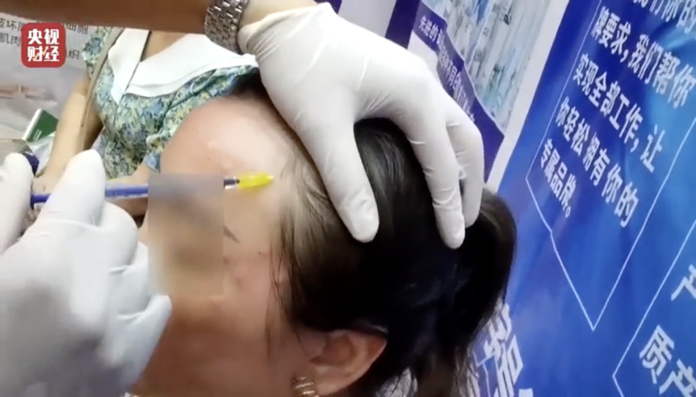 针剂注射属于医疗行为,必须由执业医师在注册医疗机构进行操作,而在展会现场,脸部注射场景屡见不鲜。在暨肽因子生物科技有限公司的展台,工作人员同样也正在为顾客的太阳穴、额头、脸颊等部位进行注射,半个小时后,客户的脸上布满了密密麻麻的鼓包。
