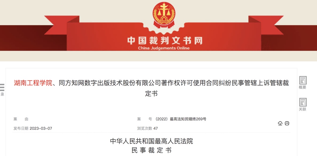 3月7日,中国裁判文书网发布的《湖南工程学院、同方知网数字出版技术股份有限公司著作权许可使用合同纠纷民事管辖上诉管辖裁定书》显示,2020年4月8日,湖南工程学院付费购买知网平台账户,获得查找文献资料并下载使用的服务。