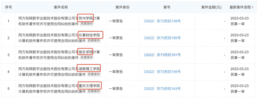 原告为同方知网公司,被告包括贺州学院、长春财经学院、陇东学院、湖南理工学院、重庆文理学院。