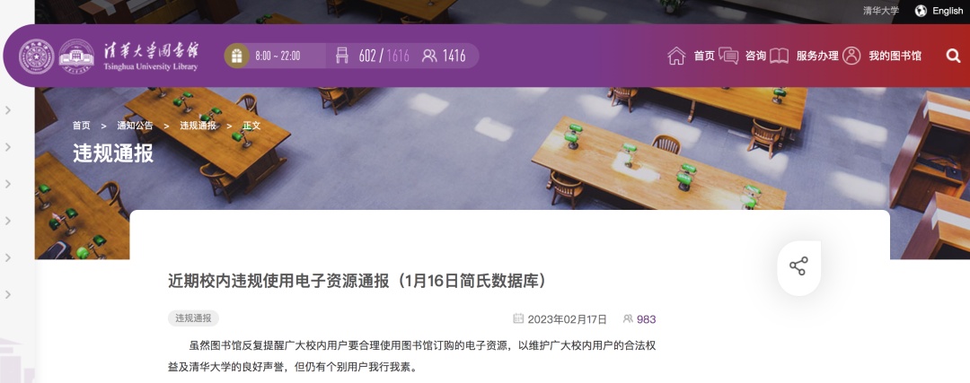 2月17日,清华大学图书馆通知称,1月16日,土木系博士研究生张某某将账号借与他人使用,造成违规下载简氏数据库资源,致使全校对该库的使用受到影响。对该同学的违规行为即日起在网上公布、停止借书权限半年。