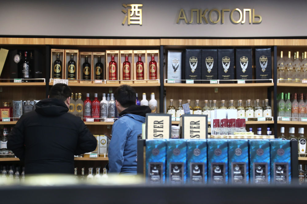 ↑3月16日,在满洲里市一家俄罗斯商品超市内,人们在选购酒类商品。新华社记者 王楷焱 摄
