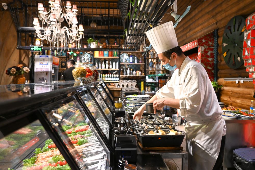 ↑3月15日,满洲里市一家俄罗斯风味餐厅的厨师在制作美食。新华社记者 贝赫 摄