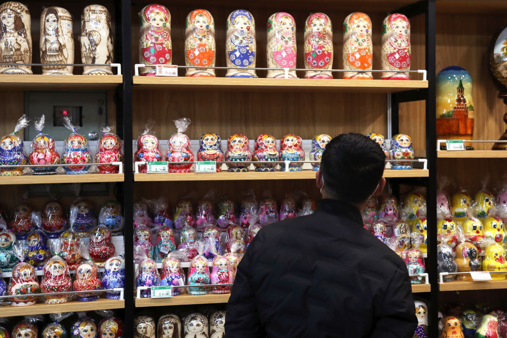 ↑3月16日,在满洲里市一家俄罗斯商品超市内,一名顾客在选购套娃纪念品。新华社记者 王楷焱 摄
