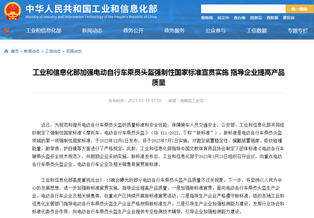 新标准是电动自行车乘员头盔领域的第一项强制性国家标准,于2022年12月1日发布,将于2023年7月1日实施,对固定装置稳定性、佩戴装置强度、吸收碰撞能量、耐穿透、护目镜等方面进行了严格规定。此前,工业和信息化部指导中国文教体育用品协会制定了团体标准《电动自行车骑乘头盔安全技术规范》,并鼓励企业采纳实施。新标准发布后,工业和信息化部于2023年3月10日组织召开会议,向重点电动自行车乘员头盔企业、电动自行车企业及相关销售商宣贯新标准。