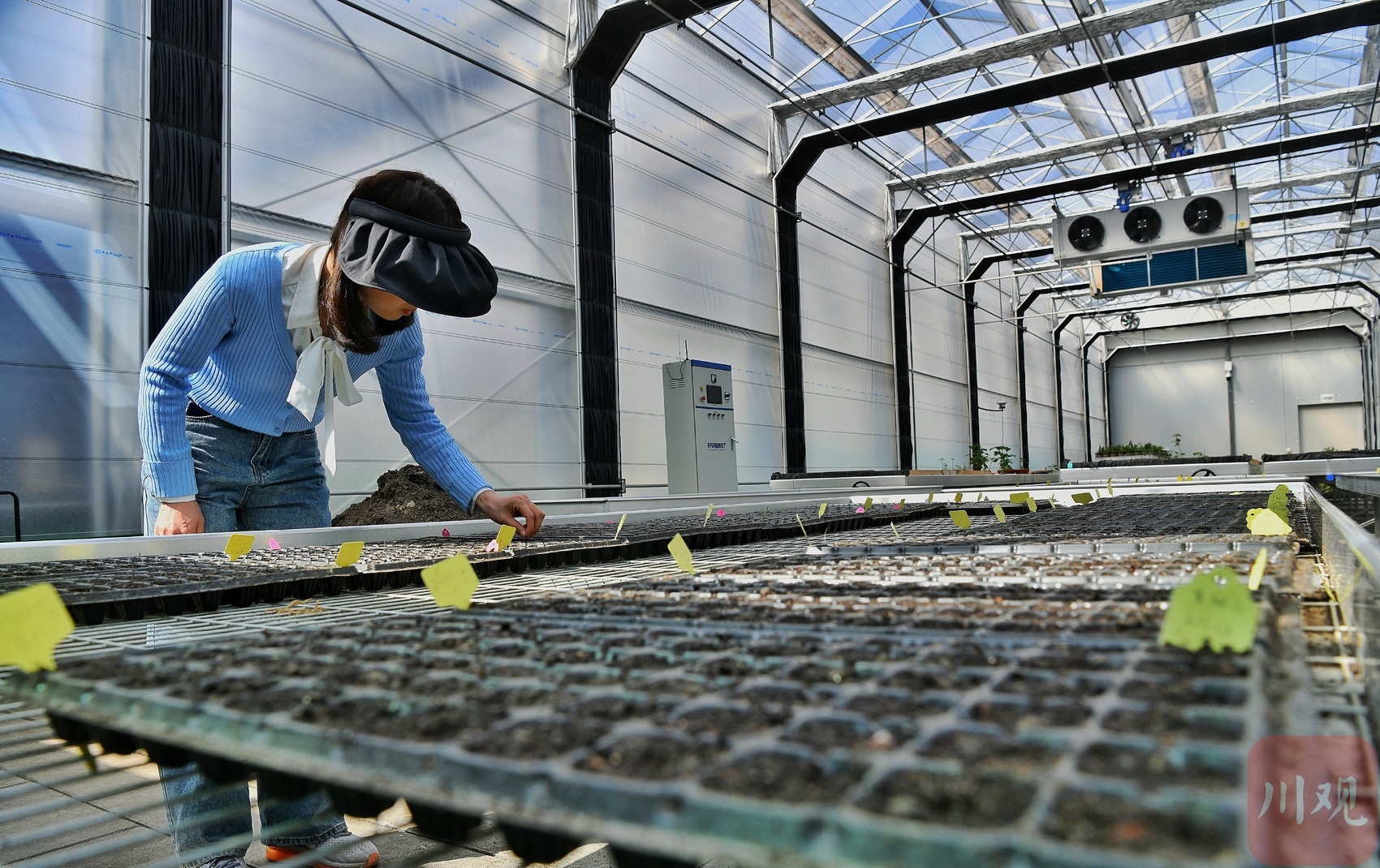 3月9日,在科研苗圃大棚内,科研人员和花工们一道在育苗架上投放太空芙蓉种子