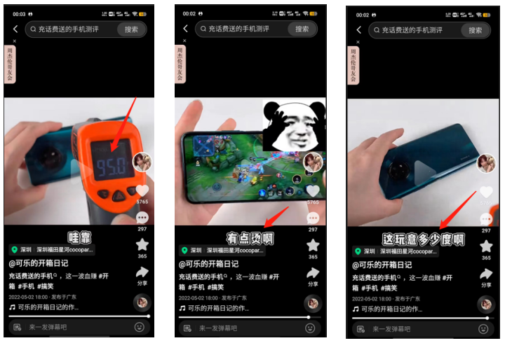 问题描述:博主对“U-MAGIC”手机进行测试,产品展示中博主表示不清楚U-MAGIC是什么牌子手机,并描述“它实际上也不是一个华为手机,处理器也不知道是一个啥”,直接进行游戏测试,在未提供测试时间的情况下,博主主观感觉“有点烫”用测温仪进行测试,测温仪显示温度95度,视频结束前博主未提到也未进行测温仪档位的确认(未明确摄氏度或华氏度)。作品缺乏有效的测评标准和数据支撑,以主观感受进行评测。