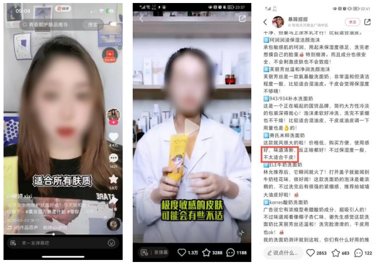 问题描述:博主测评旁氏洗面奶时,口播“适合所有肤质”,存在使用绝对性词语进行夸大现象,在对该产品进行肤质关键词搜索后,一部分博主及消费者表示该洗面奶不适合敏感肌、干皮、痘痘肌使用。