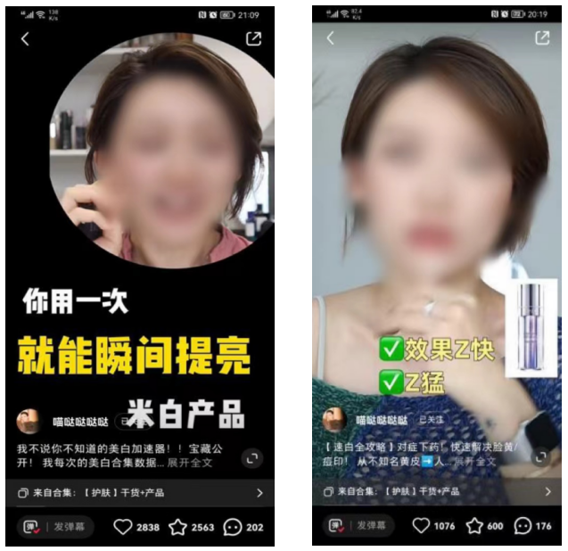 问题描述:博主在视频作品中对两款护肤产品进行夸大宣传,使用绝对性词语对产品进行相关描述。视频作品中提到“用一次就能瞬间提亮”以及“效果最快、最猛”。存在夸大产品功效,虚假宣传的现象。