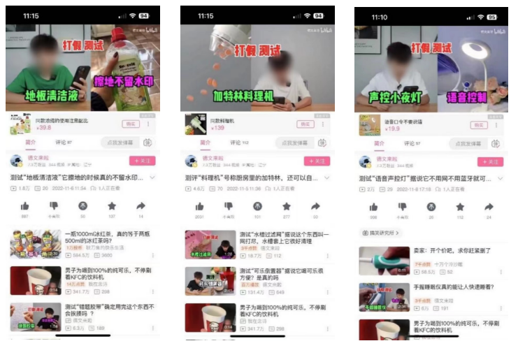 问题描述:该测评博主作品以打假为主,测评方法为主观使用体验,在实际使用中对比产品功效是否和宣传一致。2022年11月5日、6日、8日分别测评料理机、地板清洁液、语音声控灯三款产品,对测试结果表现较好的商品设置电商平台跳转链接。