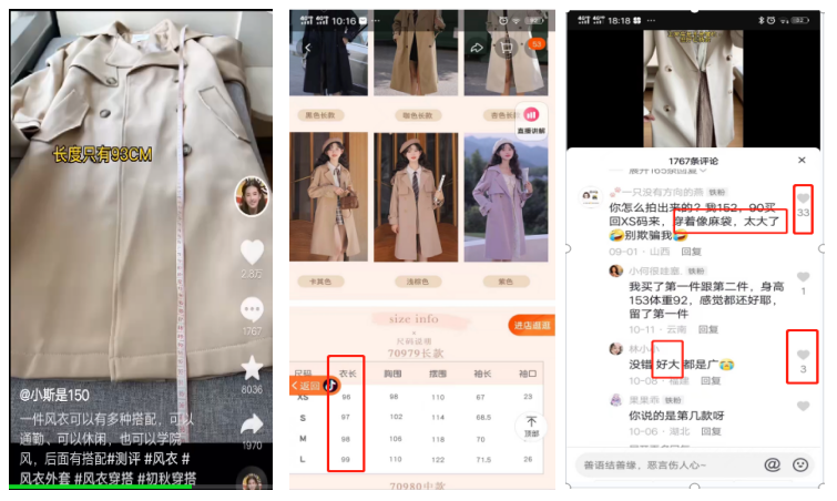 问题描述:博主对玲玖风衣进行测评推荐,在作品阐述中强调该款风衣特别适合小个子,70979型号衣长只有93CM。经查阅该商家产品数据,显示与实际尺寸不符。同时,在作品评论区部分用户反映较为强烈,表示实物与博主测评视频中展示存在出入。
