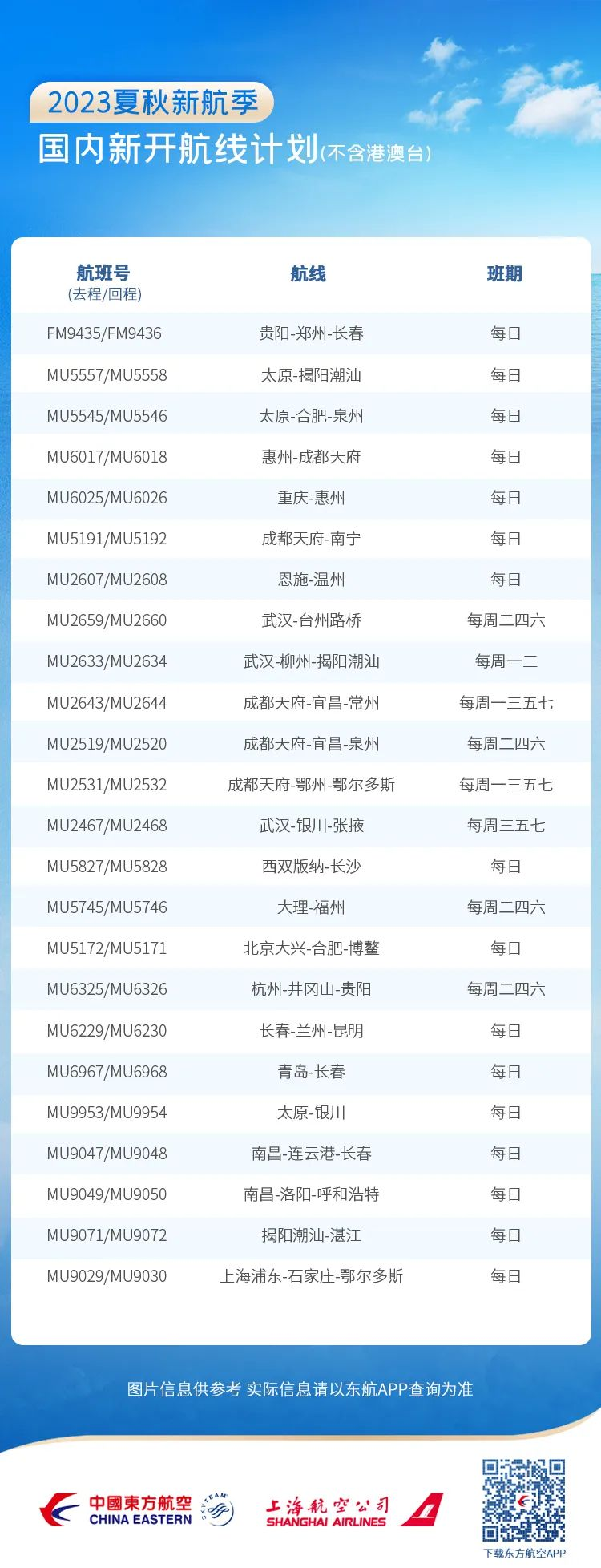 东航2023年夏秋新航季国内新开航线计划(不含港澳台)