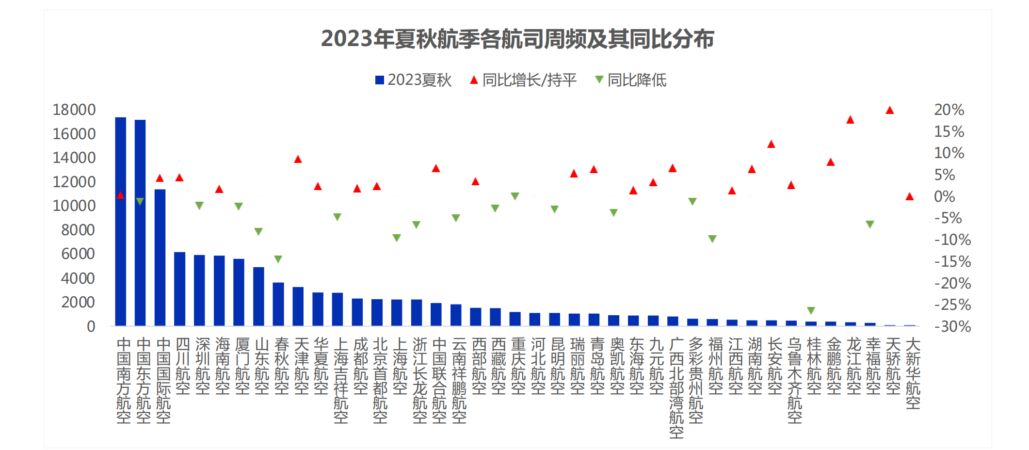 2023年夏秋航季各航司周频及其同比分布,来源于“航班管家”。