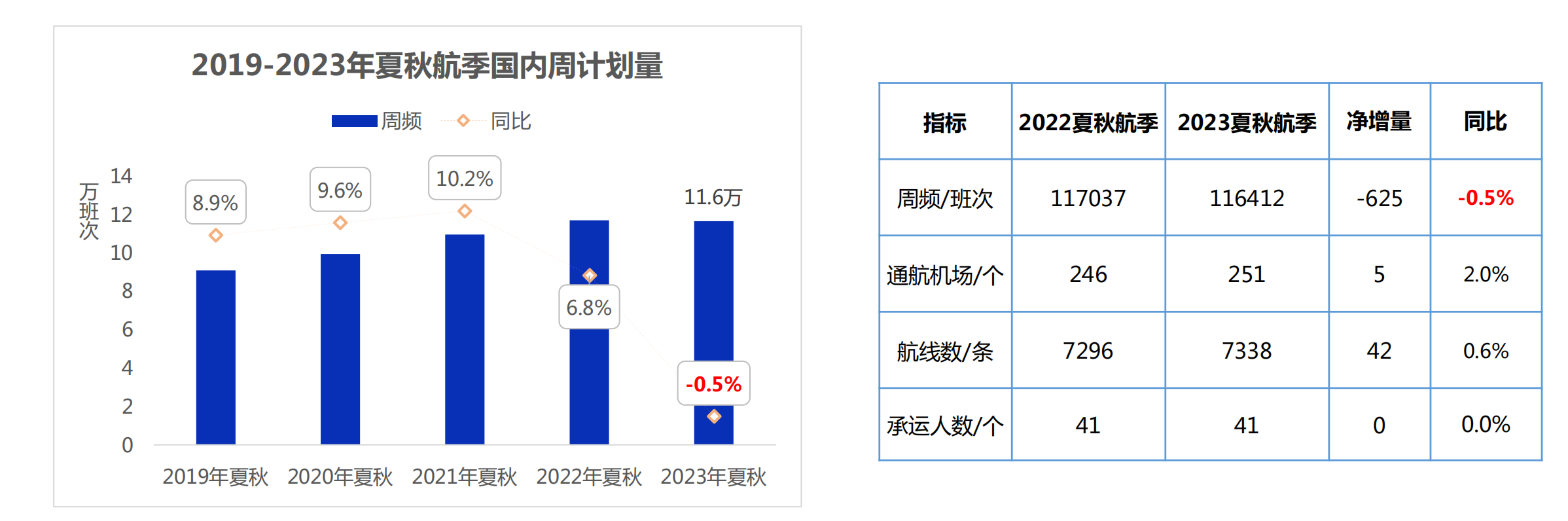 整体来看,据第三方出行数据APP“航班管家”方面消息,2023年夏秋航季,国内客运航班计划为周度计划航班量11.6万班次,同比2019年夏秋航季增长28.2%,同比2022年夏秋航季下降0.5%(日均下降89班次),根据《2023年夏航季航班时刻配置政策》,全国所有机场原则上不予新增客运航班时刻,夏秋计划航班量首次出现下滑。