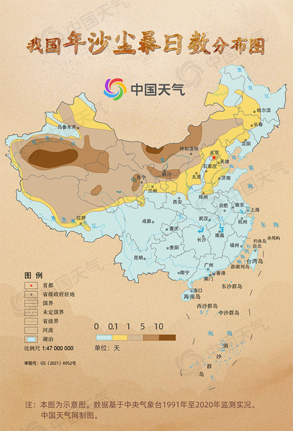 记者统计1991年至2020年来,我国沙尘暴日数的分布情况,可以看出沙尘天气主要影响我国北方地区,其中,南疆盆地和内蒙古西部两地是沙尘暴的高发区,年沙尘暴日数在10天以上,部分地区超过20天。