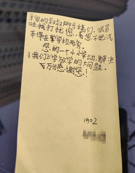 “亲爱的叔叔阿姨们,很冒昧打扰您,希望您不把汽车停在学校两旁,您的一个小小举动,将解决我们上学放学的大问题。万分感谢您!”3月22日下午,长沙麓山高岭实验学校的同学们写下一小纸条,贴在校门外停放的汽车上,呼吁车主文明有序停车。