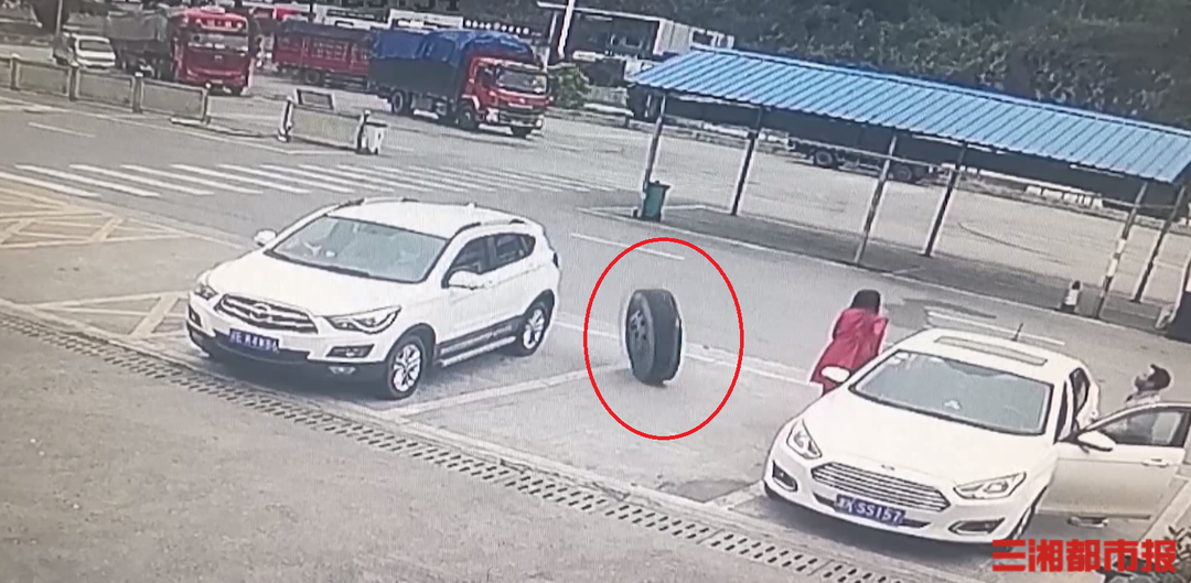 3月18日15时25分,二广高速娄底段南往北白马服务区,公共场所视频画面显示,从服务区入口匝道内突然滚出一个轮胎,轮胎一路滚动向前,先是撞倒一块警用宣传展板,随后滚向停车区域,并撞上一辆停放着的白色小车右侧车头,一旁的行人见状赶紧避让。随后这只轮胎摇摇晃晃继续向前,直到撞开便利店玻璃窗后才倒地停下。所幸整个过程,没有伤到服务区的行人。