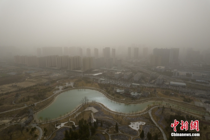 3月22日,山西省太原市遭遇沙尘天气,能见度低。当日,山西省气象台发布沙尘蓝色预警信号。图为沙尘天气下的太原双塔公园。(无人机照片) 中新社记者 韦亮 摄