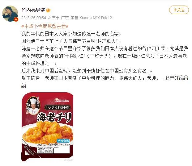 26日,知名导演竹内亮也在微博发文表示悼念。