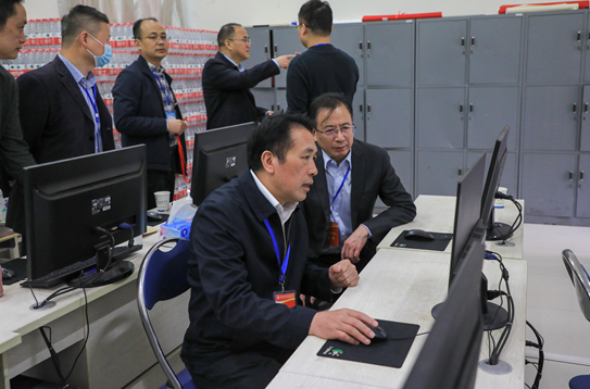 (铁科职院党委书记康月林,党委副书记、校长陈彬查看考场实时监控)