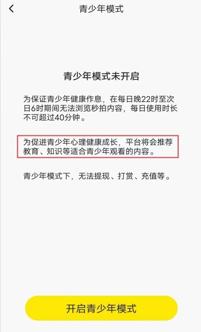 比如秒拍,平台宣称“为促进青少年心理健康成长,平台将会推荐教育、知识等适合青少年观看的内容”,但当开启“青少年模式”后,竟然一个视频内容都没有?!
