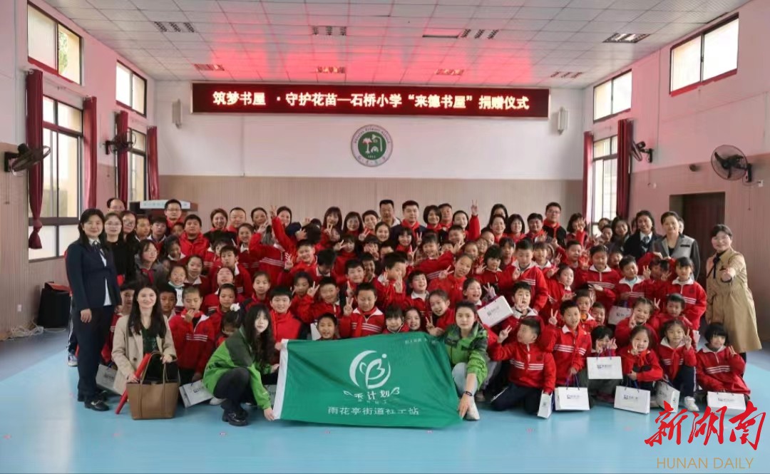 为搭建良好的图书共享阅读平台,促进学生心灵成长,在长沙市慈善总会的大力支持下,长沙市雨花区雨花亭街道社工站链接了长沙市雨花区人大代表(雨花亭街道代表团)资源在雨花区跳马镇石桥小学成功举办“来德书屋”捐建仪式,创建书香校园。长沙市雨花区人大代表李来得向石桥小学捐赠2万元用于书屋建设与图书采购,采购书单由人大代表李来德、雨花亭街道社工站负责人刘思维根据石桥小学学生的需求精心选择。
