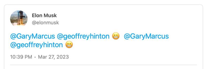 27日,推特CEO伊隆·马斯克也加入进来,表达对辛顿和马库斯的赞同。