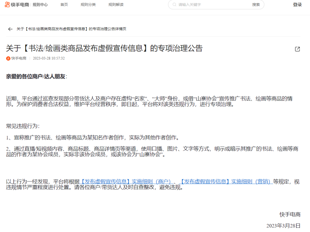 快手表示,对涉事主播“中山春雨书画院”“梧桐书画院”进行规则教育,对涉事主播进行停播和封禁处理。发布关于【书法/绘画类商品发布虚假宣传信息】的专项治理公告,对稿件反映的问题开展专项治理。该公告称,平台通过巡查发现部分带货达人及商户存在虚构“名家”“大师”身份,或借“山寨协会”宣传推广书法、绘画等商品的情形,即日起,对该类违规行为进行专项治理。一经发现,平台将根据规则,视违规情节严重程度进行处置。