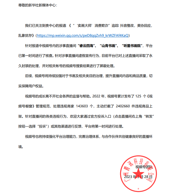 腾讯表示,视频号就报道中提及的进行虚假宣传的“睿云四海”“山青书画”“听墨书画院”等涉事直播间,采取永久封禁处理,并对相关账号的视频号搜索结果进行屏蔽处理。未来将持续加强对书画及相关类目的治理,提升直播间内容和商品质量,切实保障用户权益。