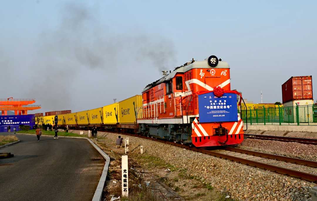 义乌—马德里“中西建交纪念号”中欧班列从义乌铁路西站驶出。胡肖飞摄