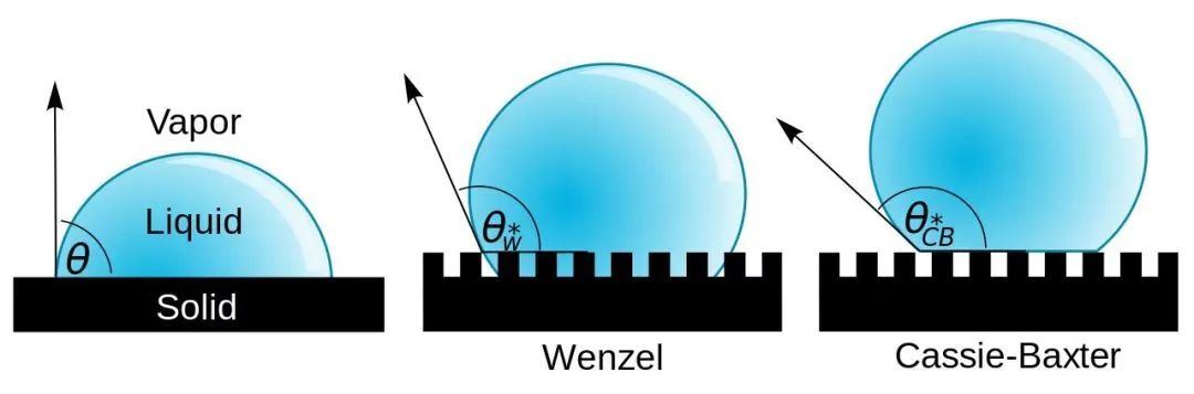 其中,γSG、γSL 和 γLG 分别是固/气、固/液和气/液的界面能。θc是液滴在三相点的切线与底面的夹角。