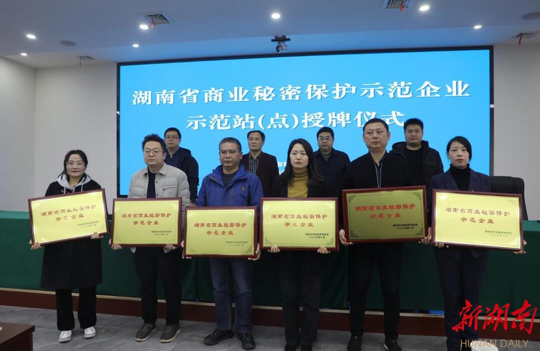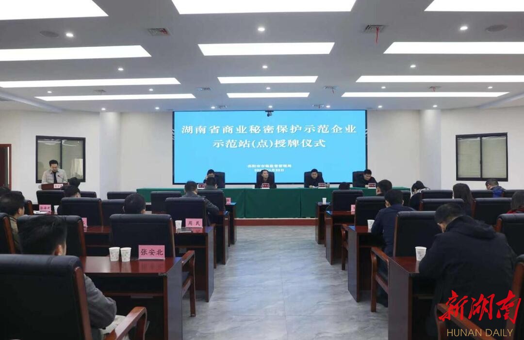 湖南日报·新湖南客户端3月24日讯(通讯员 何勇)3月23日,湖南省商业秘密保护示范企业、示范站(点)岳阳集中授牌仪式在岳阳市市场监督管理局举行。省市场监管局价监竞争局局长贺加友、副局长李君,省知识产权保护中心综合部副部长贺俊宾参加授牌。市局二级调研员颜鸿钊主持。