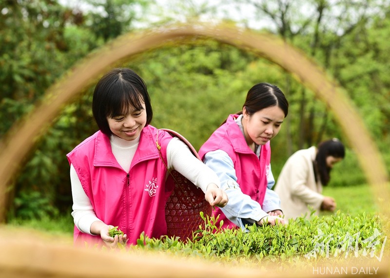3月21日,嘉禾县中华山茶园,志愿者在帮助村民采摘春茶。时下,该茶园600多亩春茶进入采摘期,当地妇联组织志愿者走进茶园,帮助茶农采摘春茶。黄春涛 摄