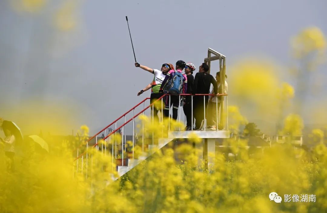 3月21日,游人在安仁县“稻田公园”里赏花自拍。