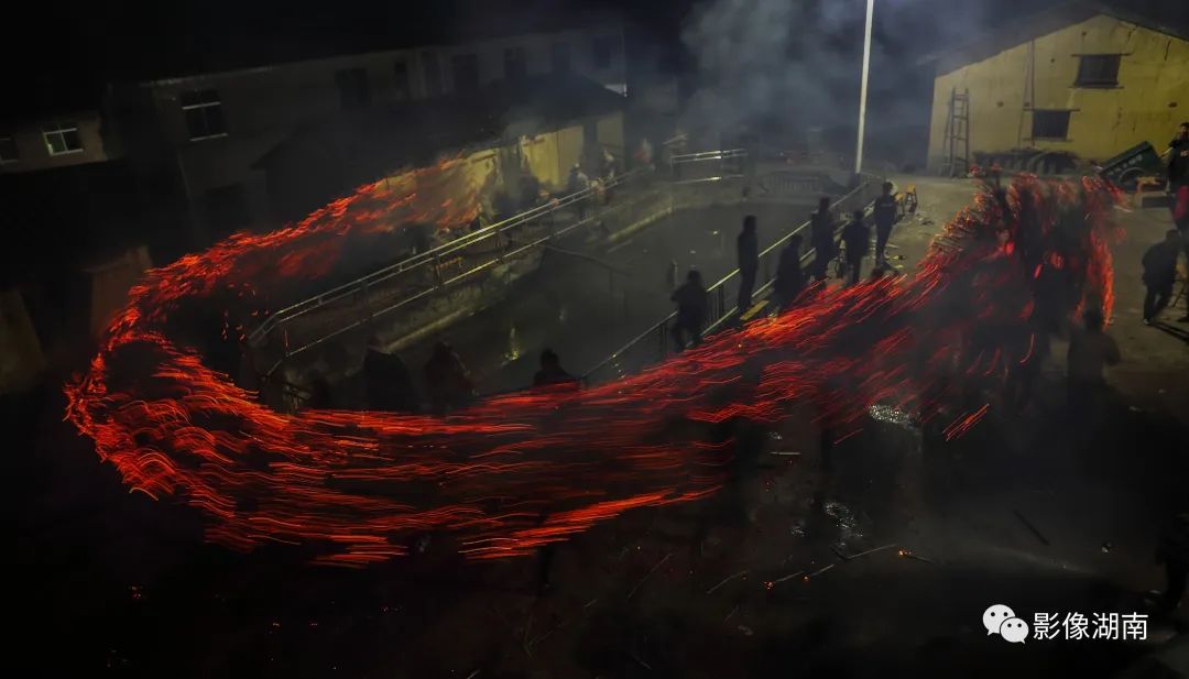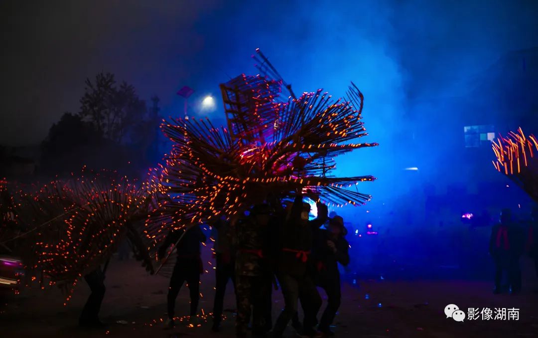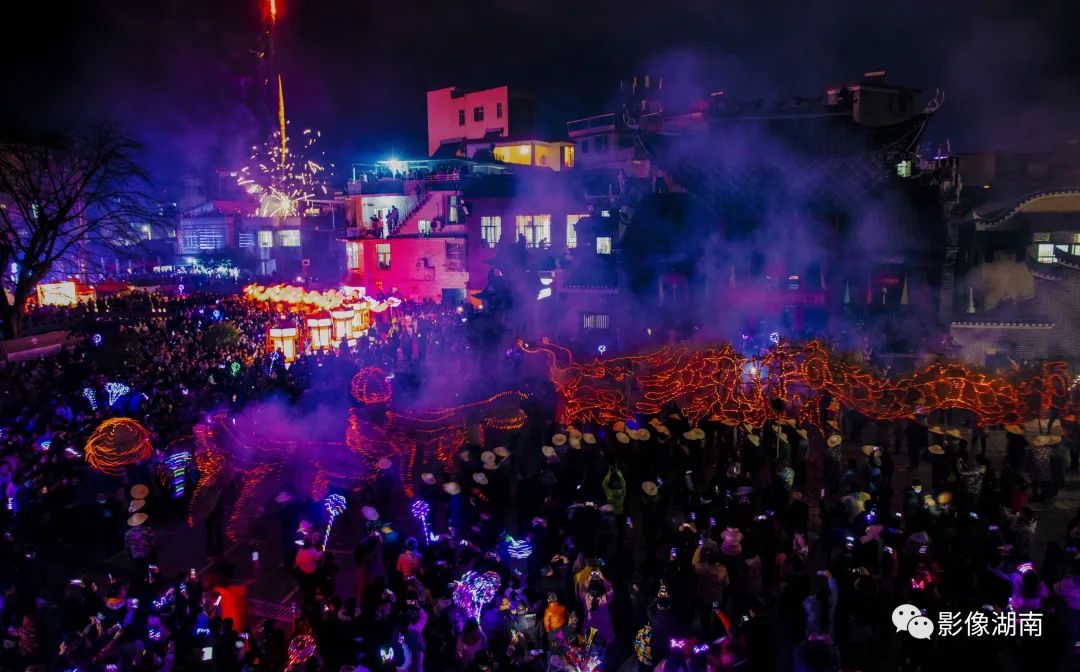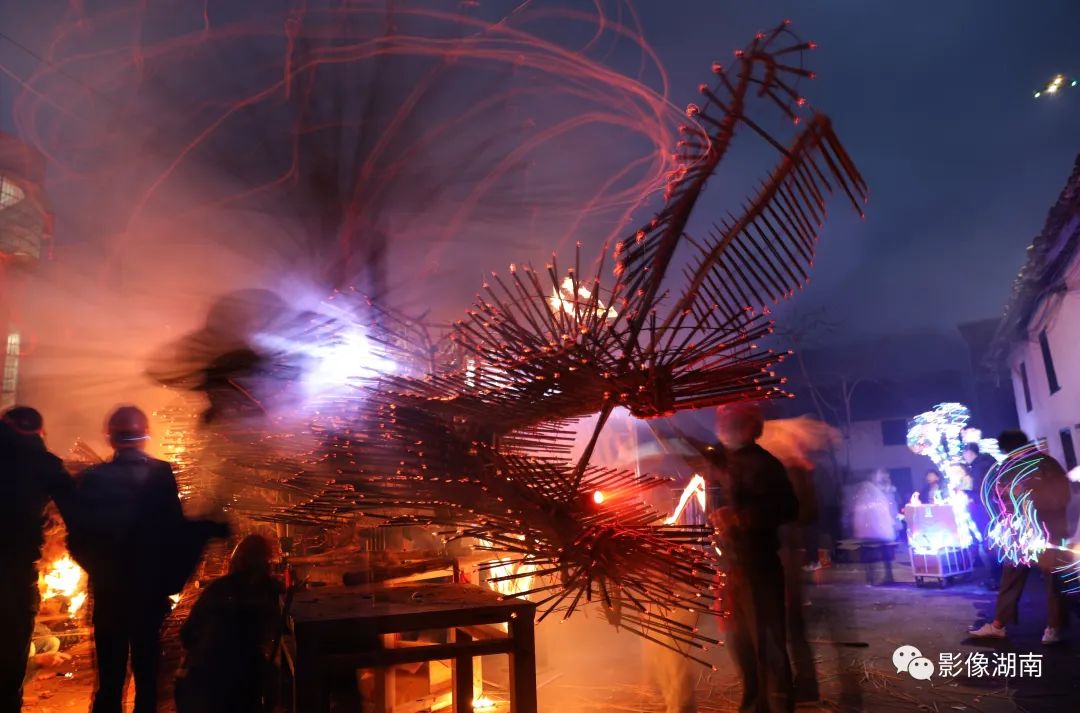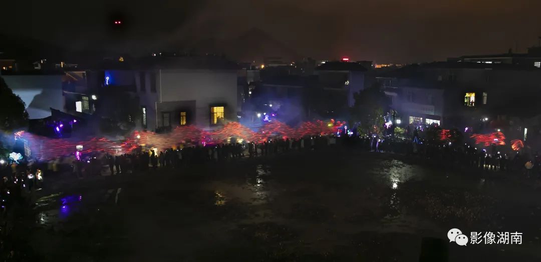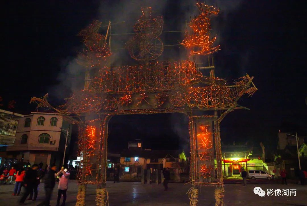 人们吹锣打鼓、燃放烟花鞭炮,到处火光闪闪,一片瑞露祥烟,场面热烈而壮观