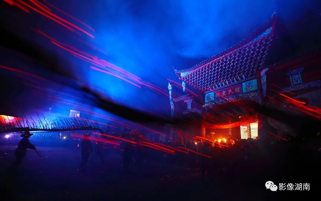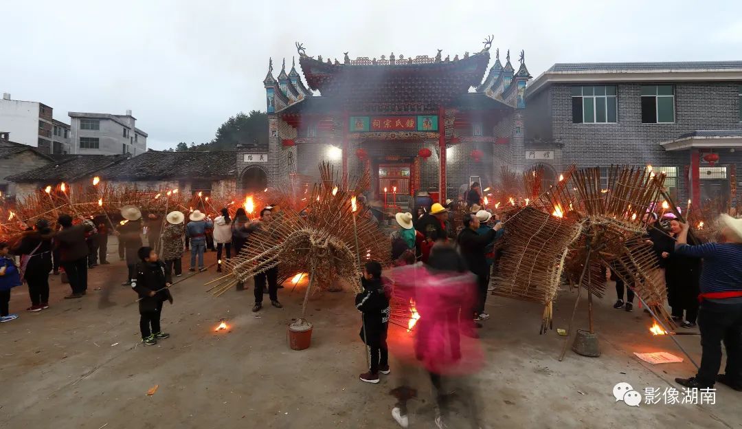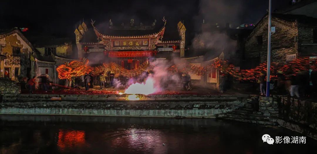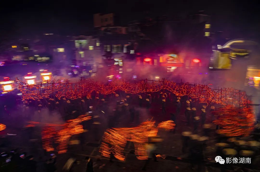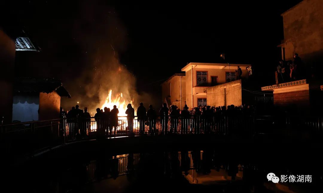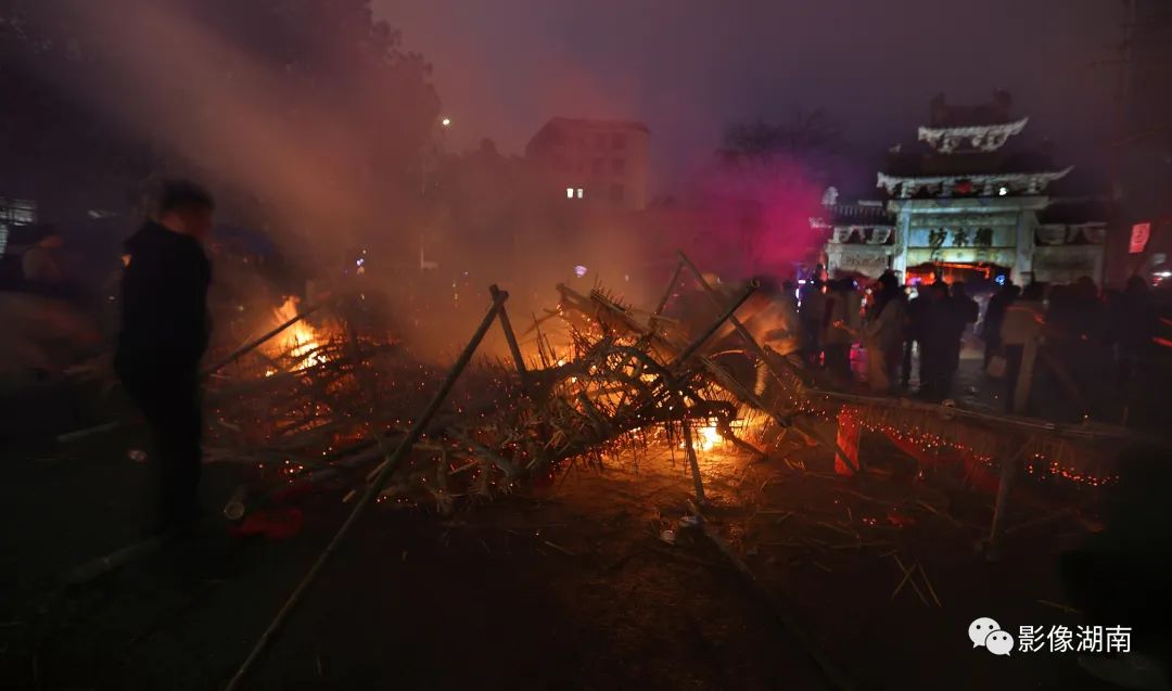 人们吹锣打鼓、燃放烟花鞭炮,到处火光闪闪,一片瑞露祥烟,场面热烈而壮观
