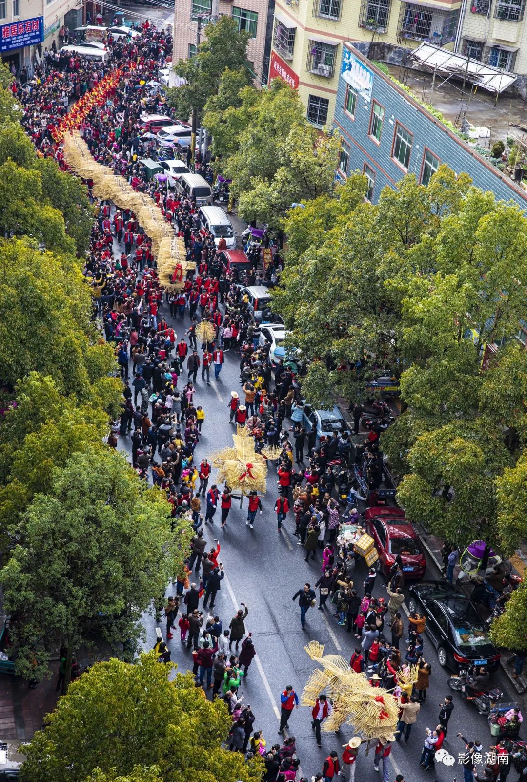 村民们抬着香火龙在街道上游行