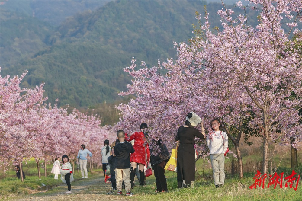湖南日报·新湖南客户端3月6日讯(通讯员 何洪海)阳春三月万物生,樱花盛妆迎客来。近日,资兴市三都镇中田村的樱花盛开,吸引了不少游客赏花。游客们走进樱花大道,观花踏春,小孩们在林中追逐嬉戏,大人们有的席地而坐,有的自拍,好一幅春意盎然的美好画卷。
