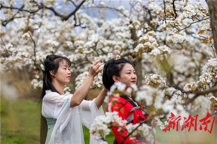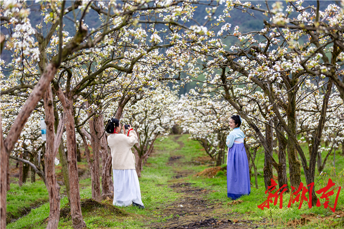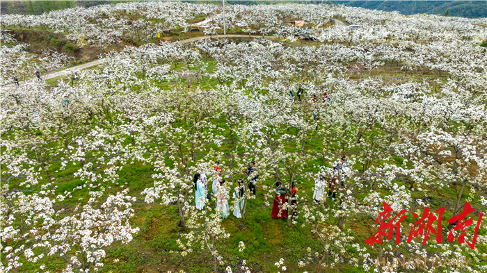 新湖南客户端3月31日讯(通讯员 曾元春)近日,湘西土家族苗族自治州龙山县茅坪乡老场村梨园内,万株梨花竞相开放,洁白如雪,香气袭人,吸引周边众多游客穿上汉服前来打卡游玩。