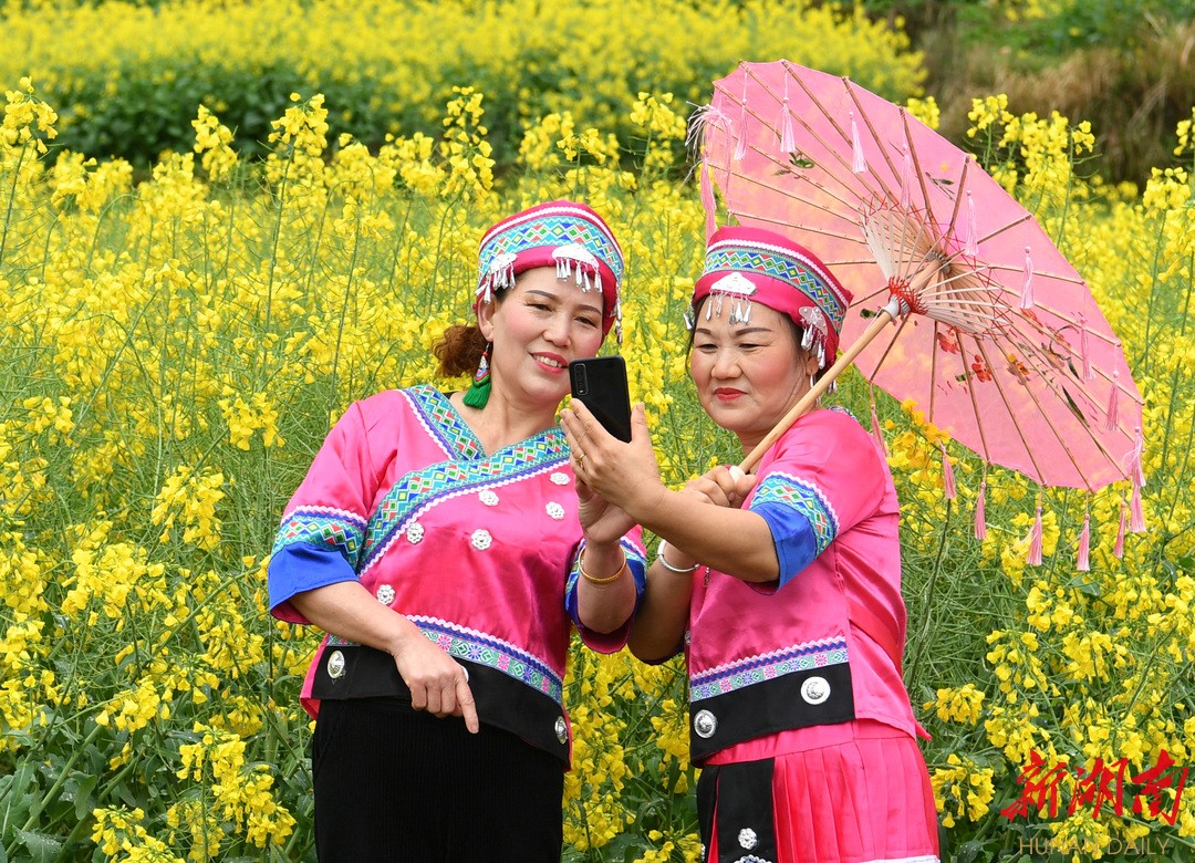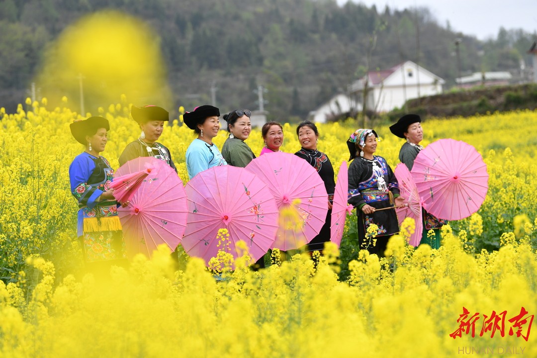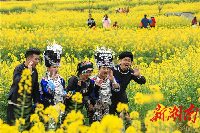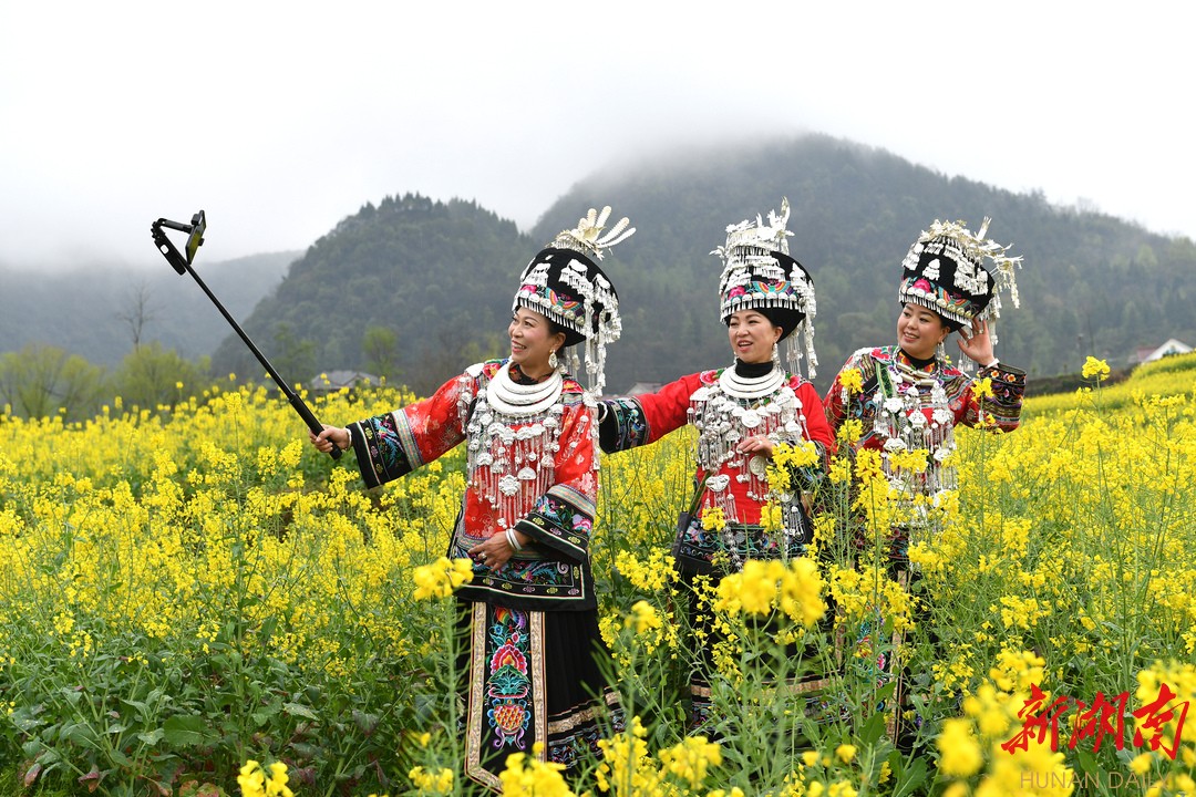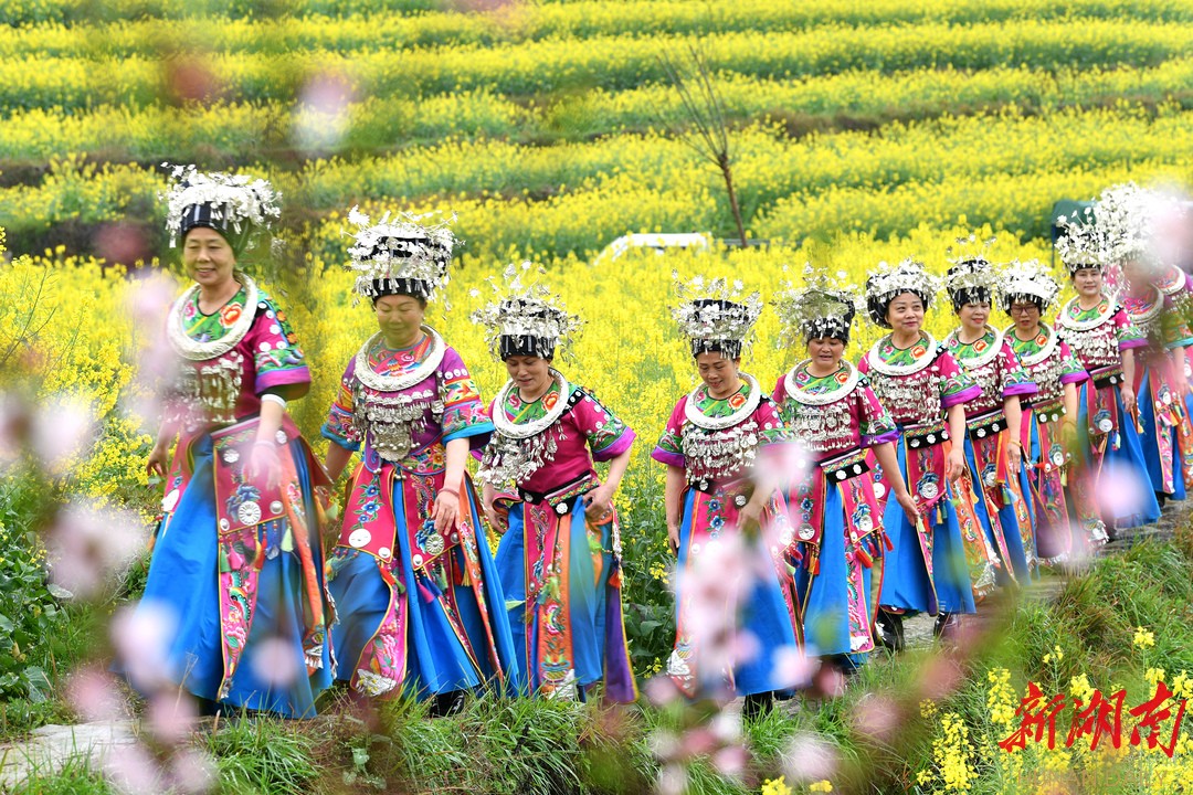 湖南日报·新湖南客户端3月26日讯(记者 向莉君 特约记者 袁昌俊 通讯员 吴德艳)3月26日,2023年中国·十八洞首届油菜花节系列活动之一——苗族服饰田间走秀,在湘西土家族苗族自治州花垣县麻栗场镇沙科村千亩油菜花海间靓丽上演。近百名苗家阿姐身穿刺绣精美的民族服饰,在1200亩金灿灿的油菜花间秀出“最炫民族风”。
