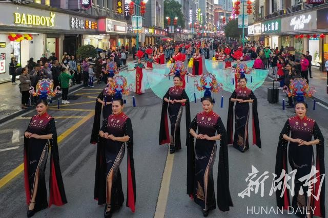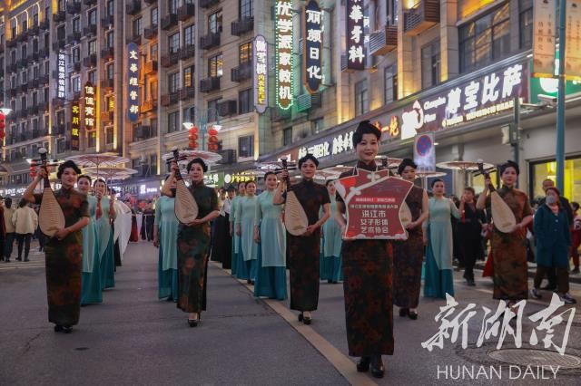 当晚,洪江古商城灯光璀璨,近千名旗袍爱好者身着各色旗袍,在新民路传统商业街、洪江古商城1915广场、烟雨洪江街区、半个铜钱剧场巡游表演,为市民和游客带来一场异彩纷呈的视觉盛宴。