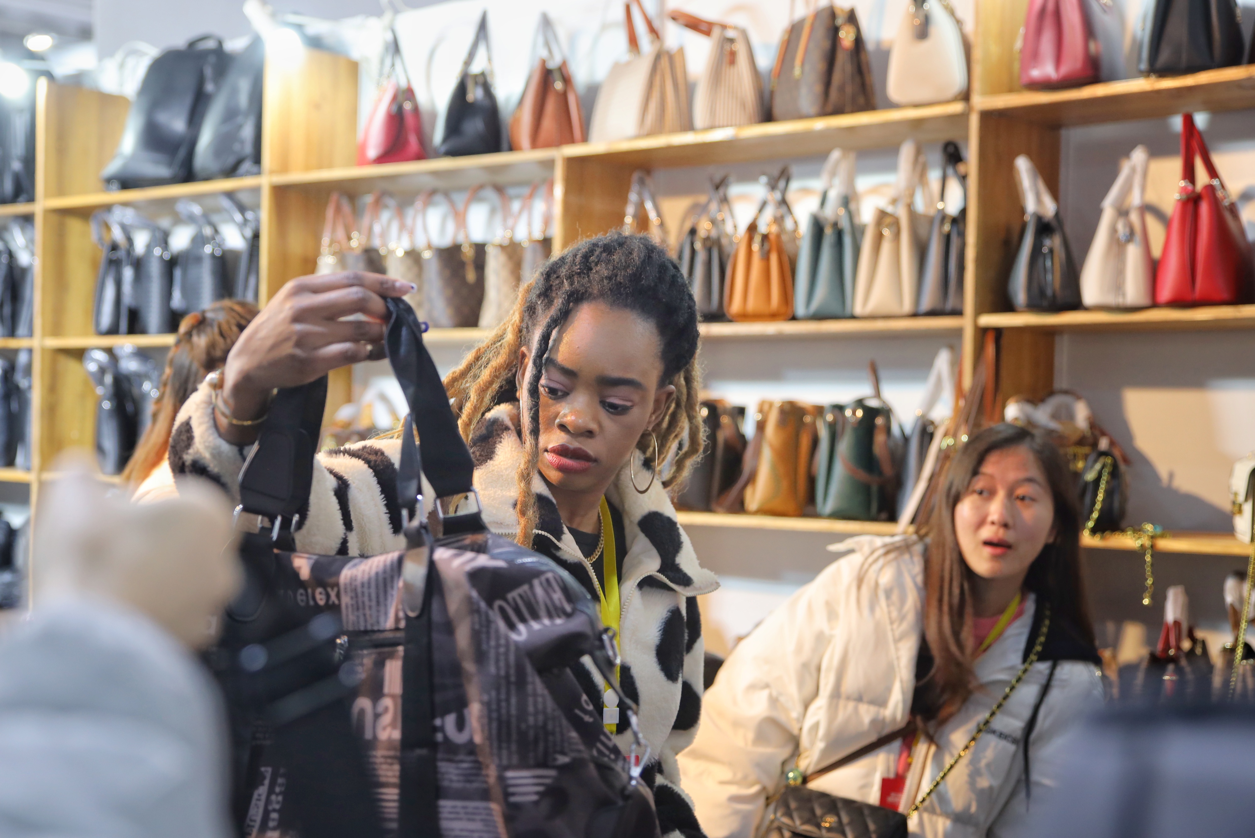 第三届永州·蓝山国际皮具箱包博览会上,外国客商在挑选产品。彭华 摄